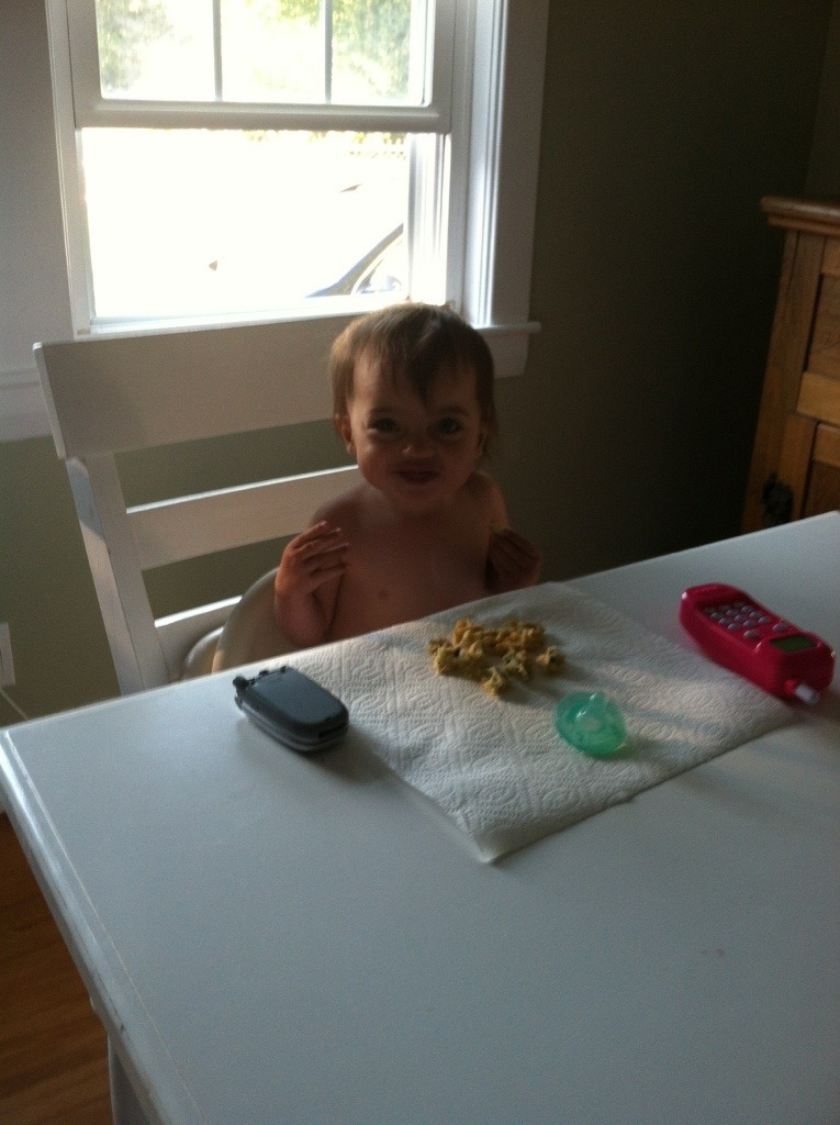 Olivia eating breakfast at the big table before her first day in the toddler classroom.