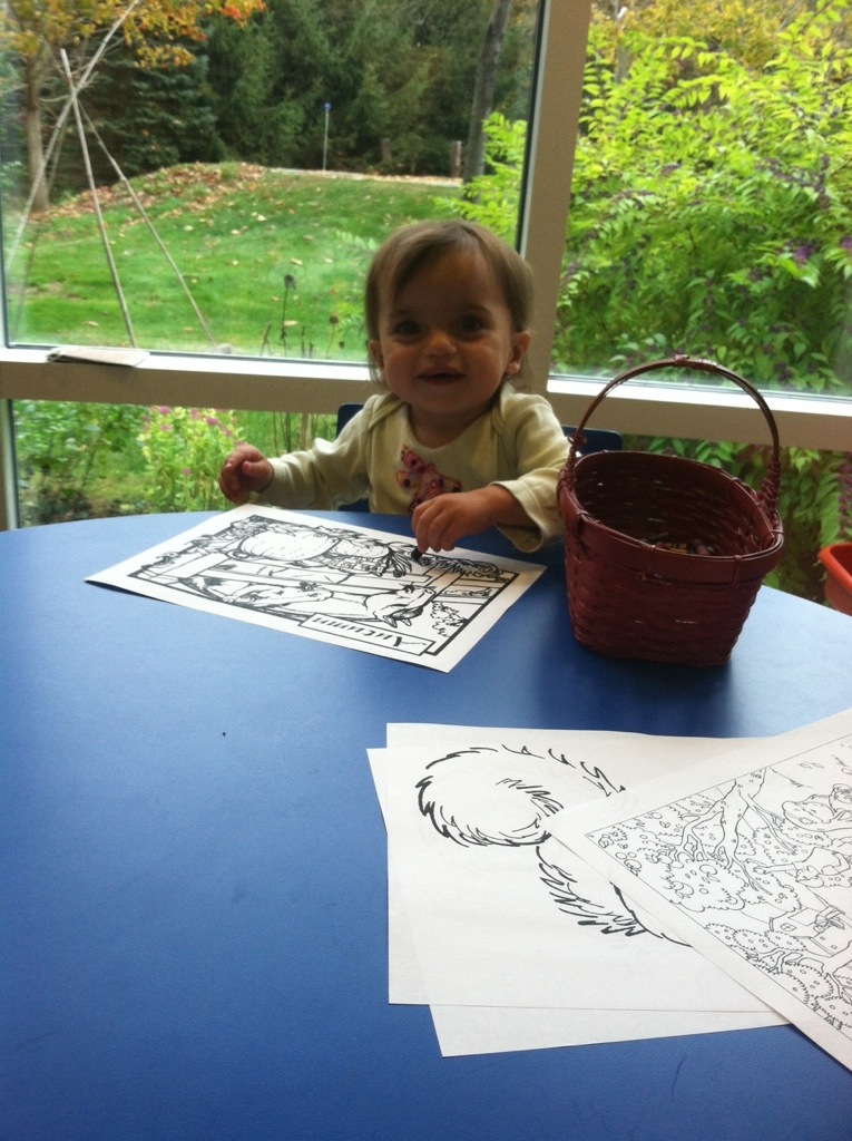 Olivia coloring at the library